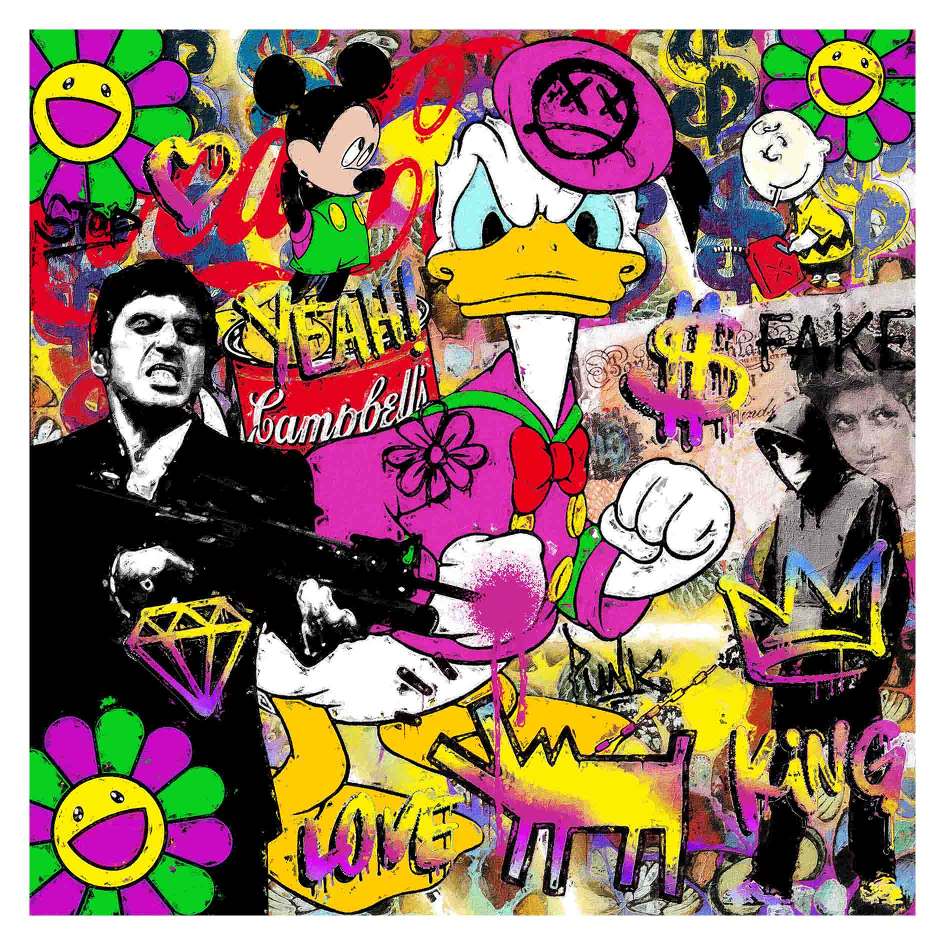 Punk King is a bold fusion of rebellion, irony and nostalgia. Cartoon icons meet cinematic antiheroes in a chaotic explosion of colors, graffiti and pop references. The work celebrates freedom, attitude and the playful spirit of street art, transforming familiar figures into symbols of defiance and self-expression.