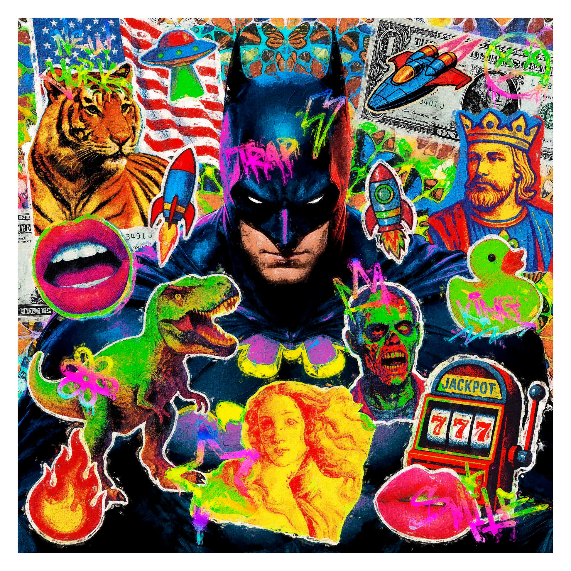 A vibrant collision of pop icons and street energy, “Urban Knight” reimagines the myth of the superhero as a symbol of modern chaos and cultural fusion. Surrounded by neon creatures, classic art fragments, and urban graffiti, the dark figure becomes a mirror of our collective imagination where strength, irony, and excess coexist in a dazzling visual storm.